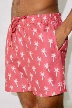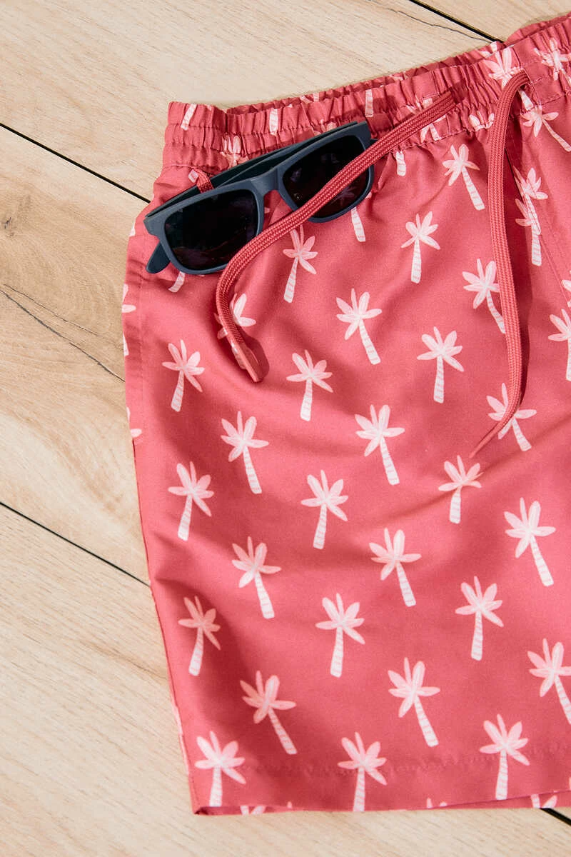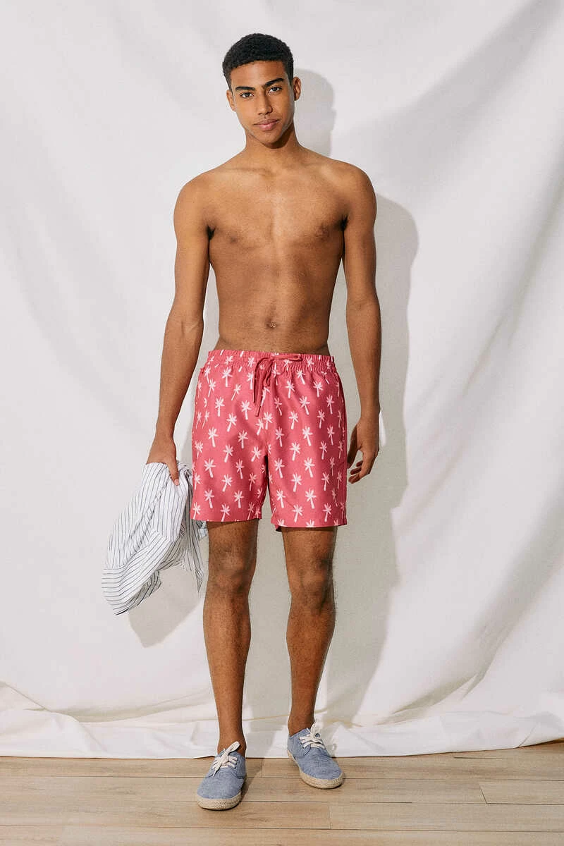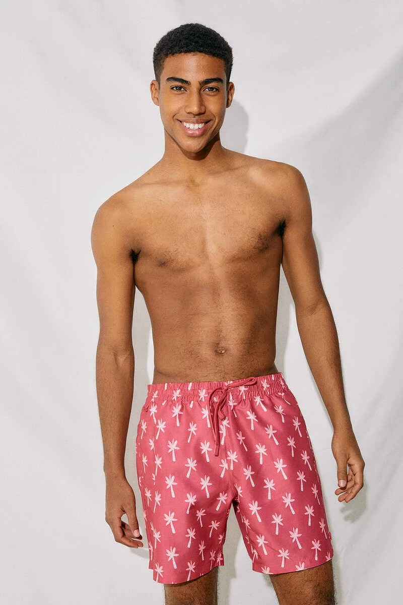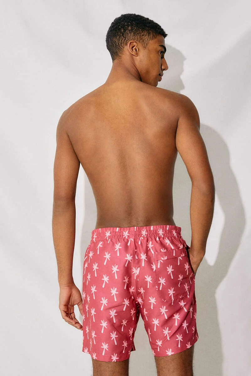 Bañador estampado con motivo de palmeras, de largo medio, en tejido de poliéster reciclado con secado rápido. Con malla interior de poliéster con tacto suave, cinturilla elástica ajustable con cordón a contraste, bolsillos laterales y trasero, tirador para gafas de sol, y etiqueta decorativa. Proyecto RECONSIDER.