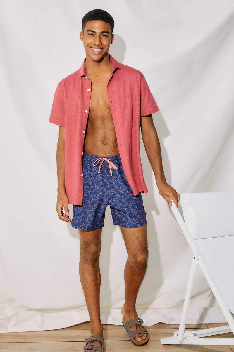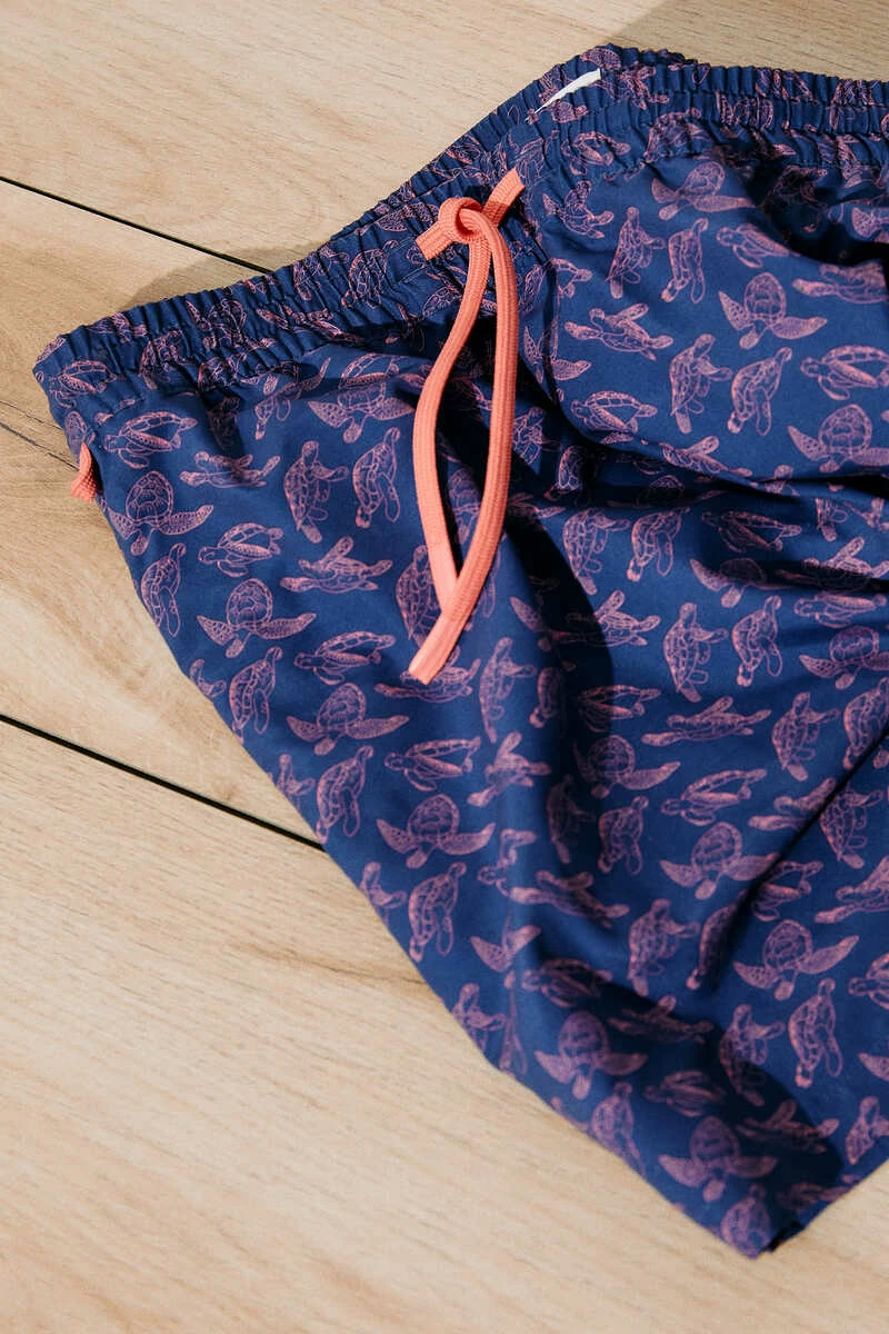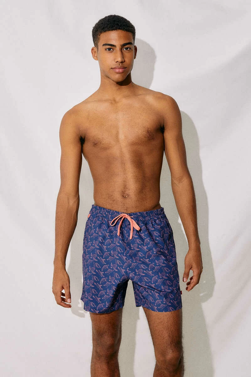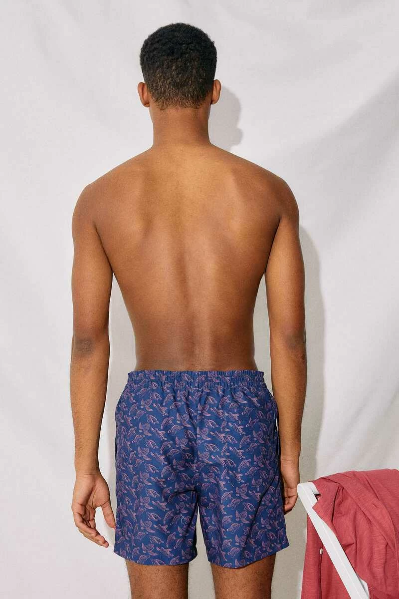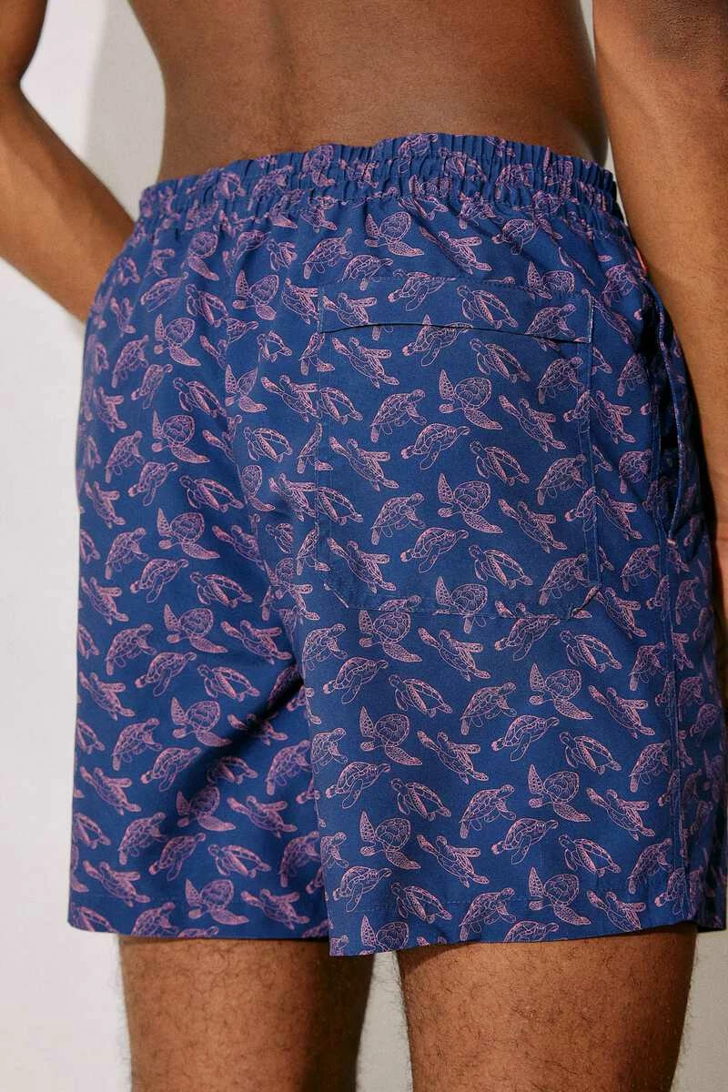 Bañador estampado con motivo de tortugas, de largo medio, en tejido de poliéster reciclado con secado rápido. Con malla interior de poliéster con tacto suave, cinturilla elástica ajustable con cordón a contraste, bolsillos laterales y trasero, tirador para gafas de sol, y etiqueta decorativa. Proyecto RECONSIDER.