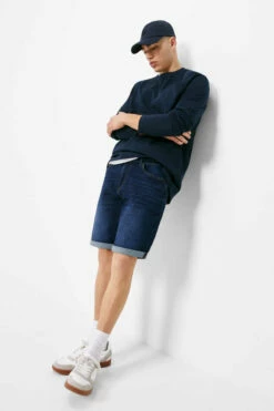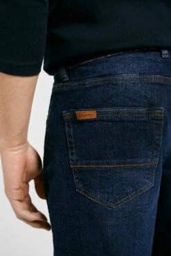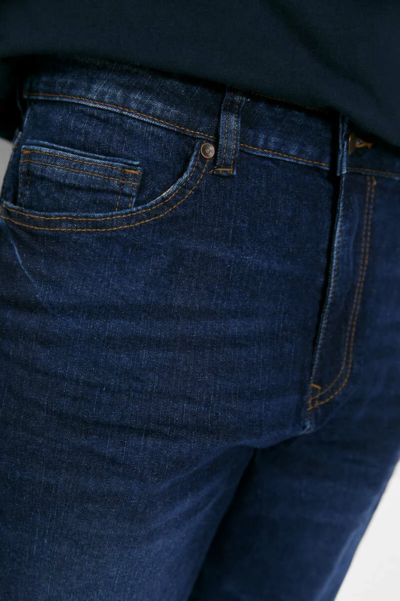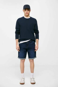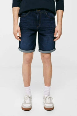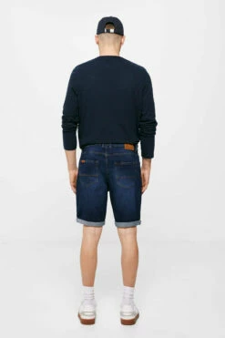 Bermuda vaquera 5 bolsillos elástica en fit regular. Diseño con vueltas en los bajos y detalle de etiqueta de microfibra en bolsillo cerillero. Lavado oscuro de aspecto usado con arrugas en el frontal y detalles de rozados. Lavado ECO-WASH realizado con técnicas sostenibles de láser, ozono y lavadoras eficientes. Con estas tecnologías sostenibles reducimos el consumo de agua, químicos y energía. Cierre bragueta con cremallera. Proyecto RECONSIDER.