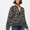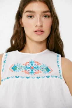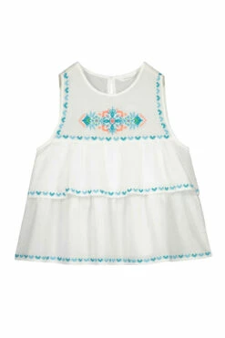 Blusa sin mangas, con cuello redondo, con abertura en la espalda con cierre de botón, con volantes con bordados en el cuerpo, con flor bordada en el canesú en varios tonos.