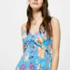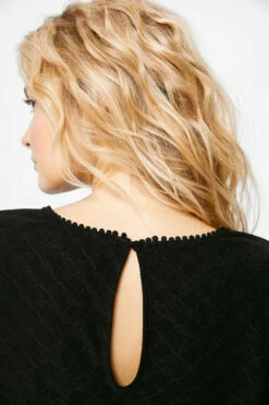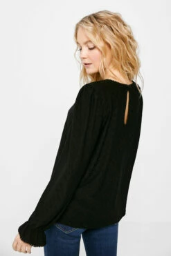 Blusa lisa de manga larga, con cuello redondo, con abertura en la espalda en forma de lágrima con cierre de botón, con goma en los puños con volante, con bordado suizo de circular y con detalle de lace de bolitas en el cuello, los hombros y los puños.