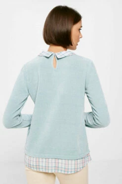 Blusa lisa de manga larga, con cuello redondo, con abertura en la espalda en forma de lágrima con cierre de botón, con goma en los puños con volante, con bordado suizo de circular y con detalle de lace de bolitas en el cuello, los hombros y los puños.