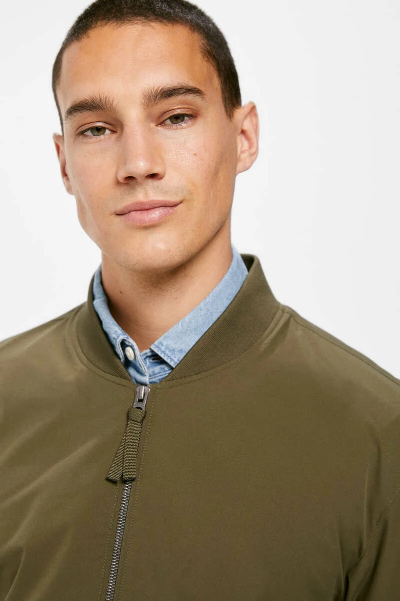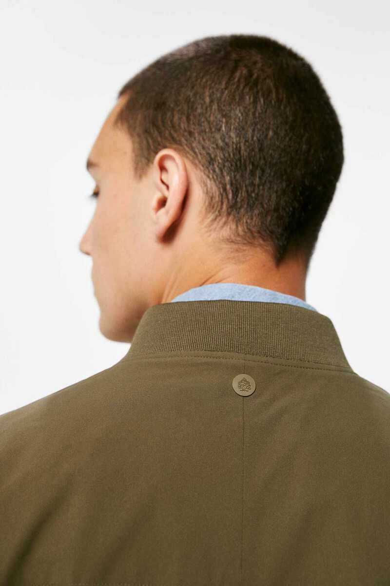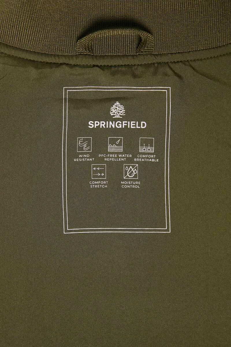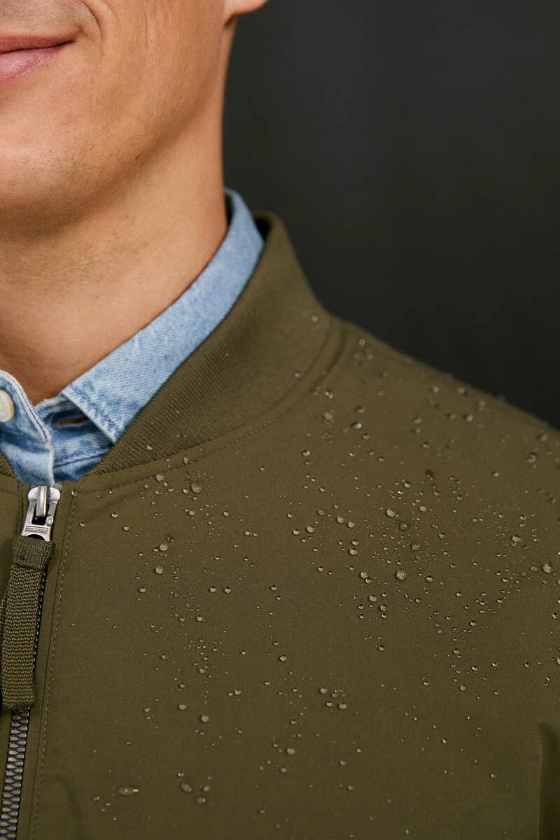 Chaqueta bomber técnica en tejido de poliéster repelente al agua libre de PFCs, resistente al viento, transpirable y ‘comfort stretch’. Forrada con tejido transpirable con efecto ‘moisture control’. Con cierre de cremallera, bolsillos con botones automáticos, cuello, bajo y puños en punto elástico, bolsillo interior, y detalle de etiqueta decorativa.