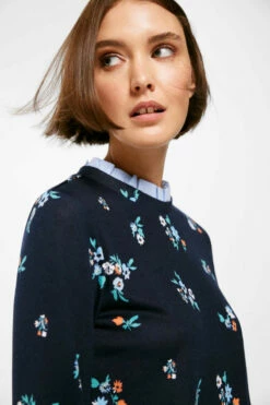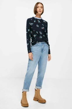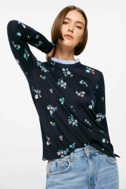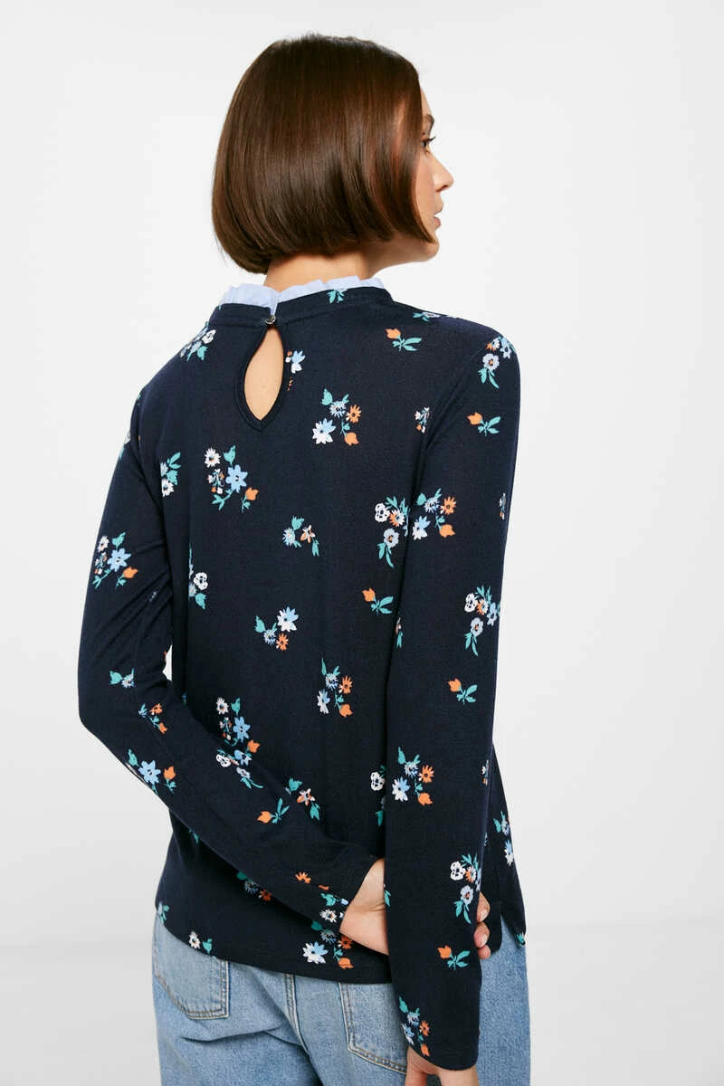 Camiseta de manga larga, con cuello redondo con detalle de minivolantes, con abertura en la espalda en forma de lágrima con cierre de botón, con estampado de flores y de punto cortado.