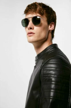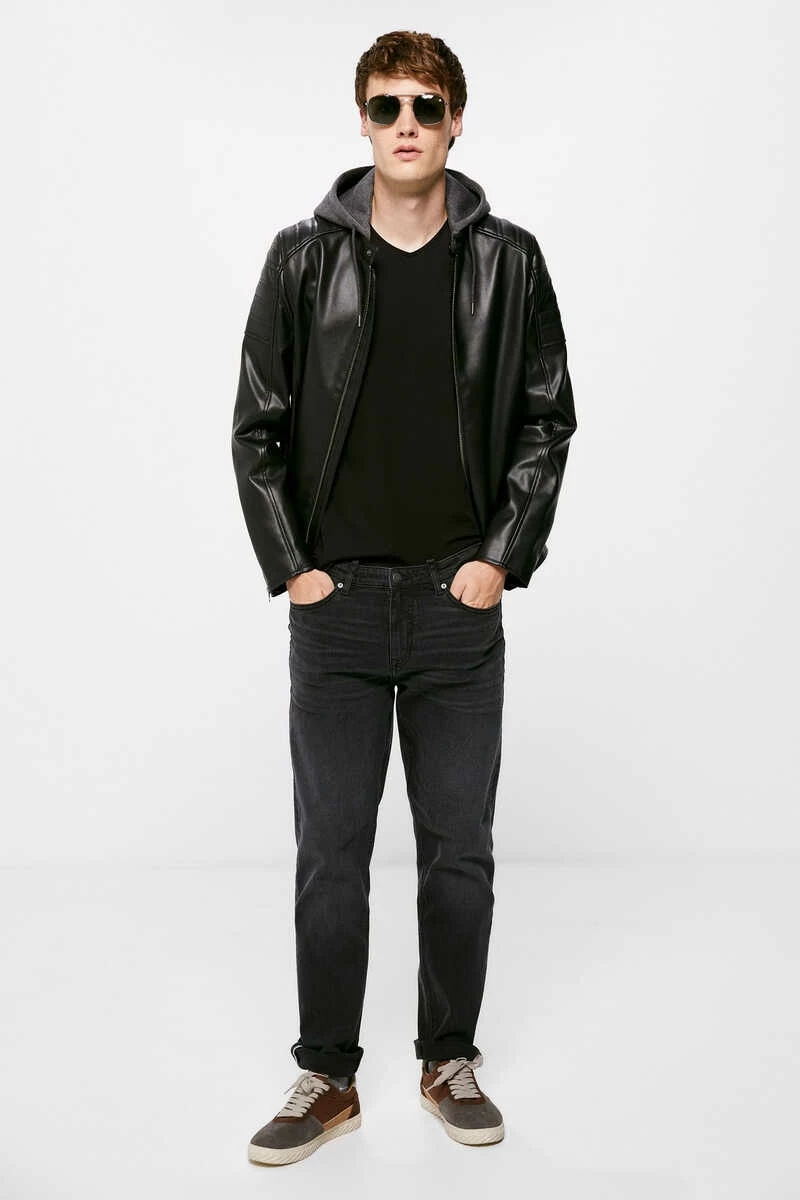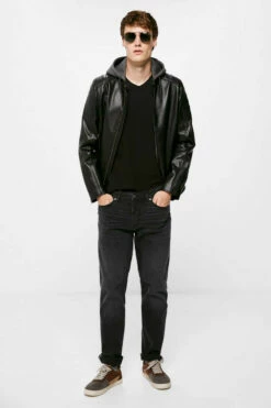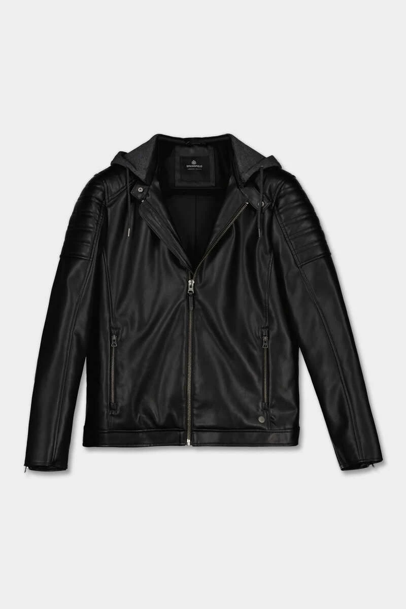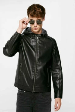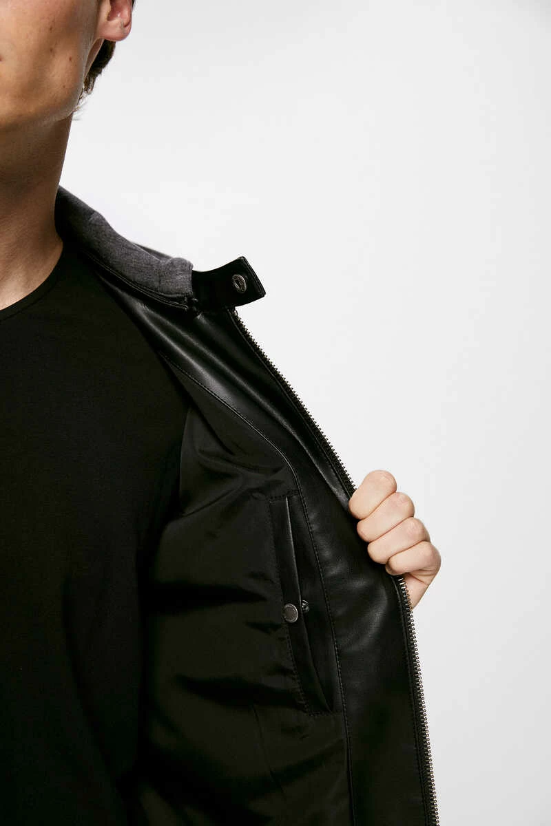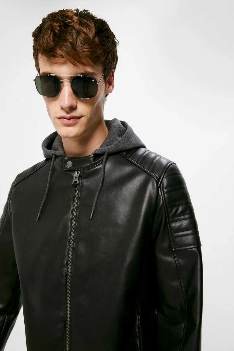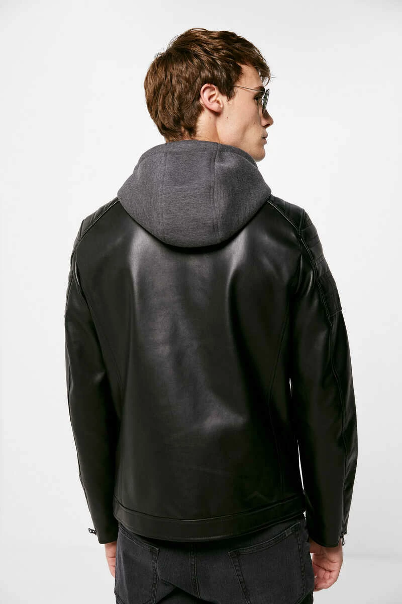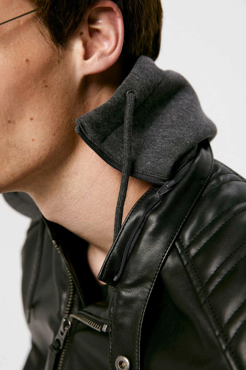 Cazadora estilo motero en tejido efecto piel con áreas acolchadas y capucha de felpa desmontable y ajustable, y con forro de poliéster reciclado. Con cuello tirilla, cierre, bolsillos y puños con cremalleras, bolsillo interior, y detalle de etiqueta metálica decorativa. Proyecto RECONSIDER.