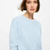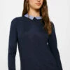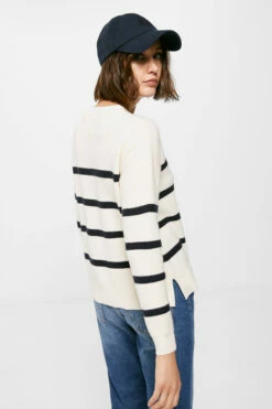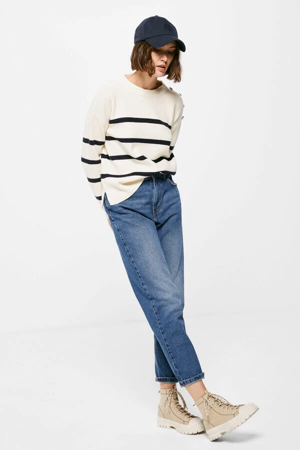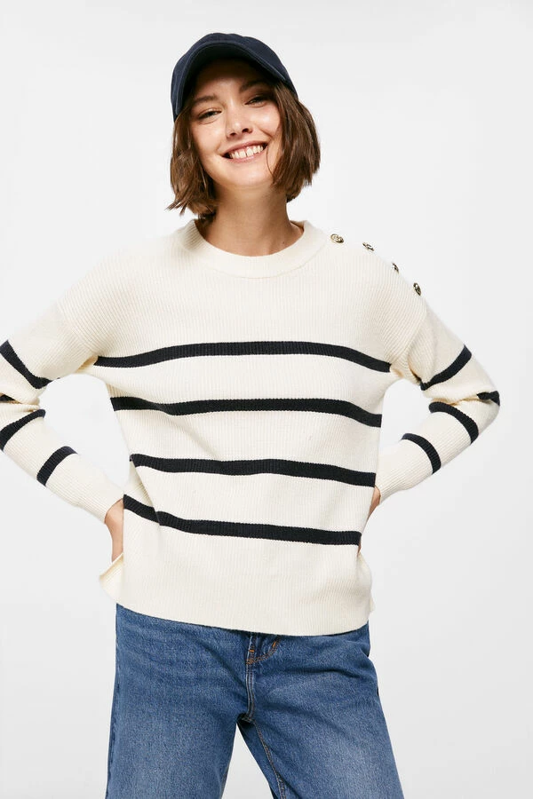 Jersey de manga larga caída, con cuello redondo, con botones dorados en un hombro, con contraste de color en los puños y en el bajo, con rayas horizontales marineras.