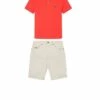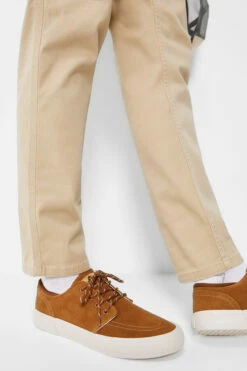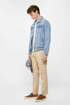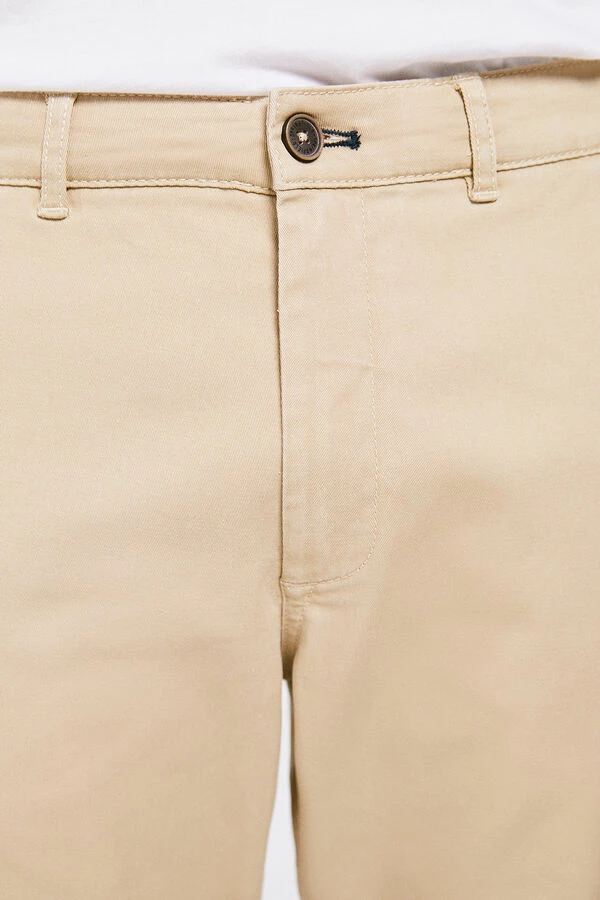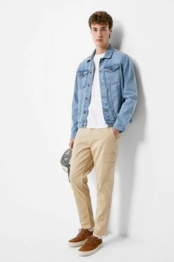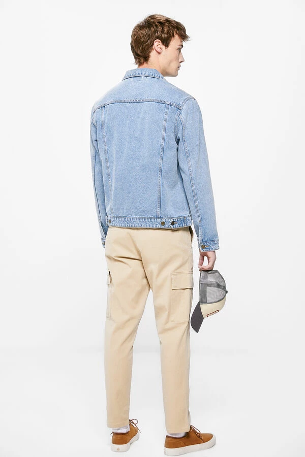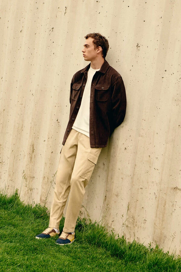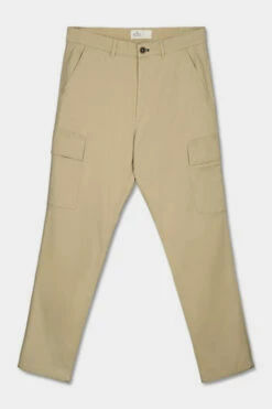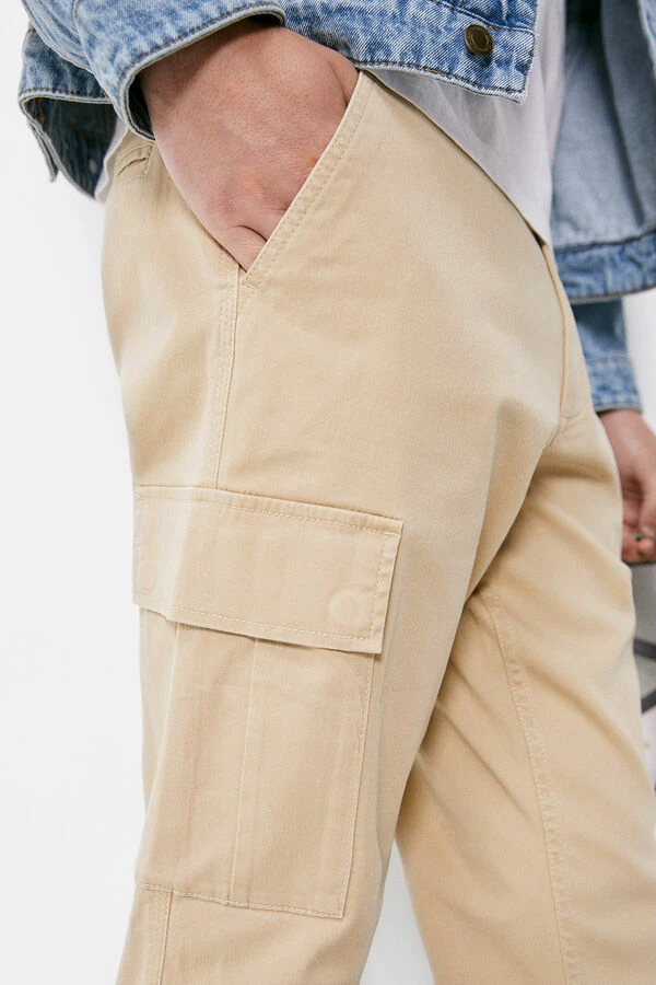 Pantalón tipo cargo con bolsilllos laterales en tejido de algodón elástico. Forro de bolsillo con estampado de rayas. Cierred e botón en cinturilla y cremallear en bragueta. Proyecto RECONSIDER.