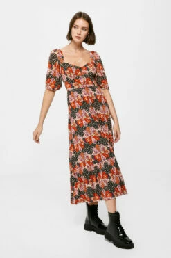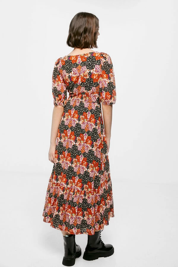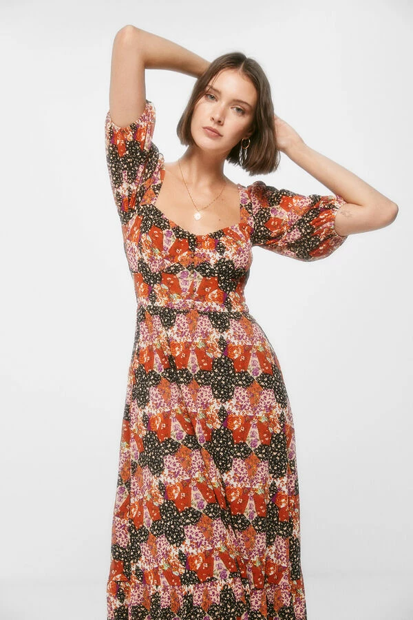 Vestido de manga 3/4s con volumen, con escote de corazón, con corte en la cintura, con goma en la espalda, con falda con vuelo con volante en el bajo y con estampado de flores.