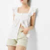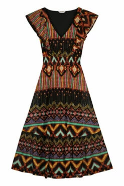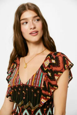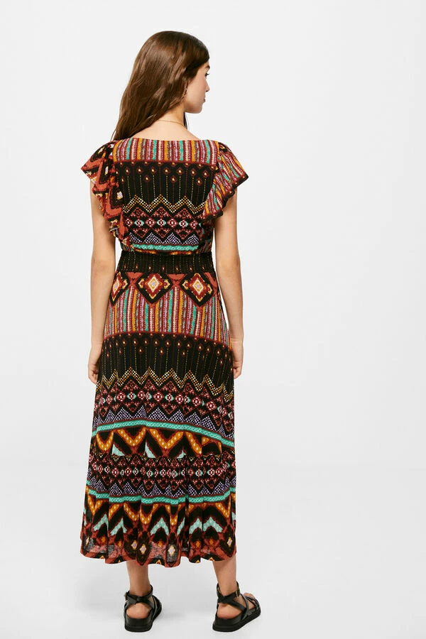 Vestido midi de tirantes, con escote en uve, con detalle de volantes en el canesú posicionados en los laterales, con goma en la cintura con estampado a contratse.